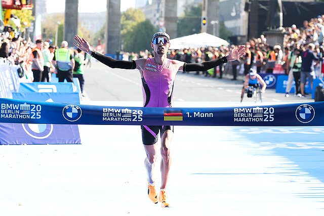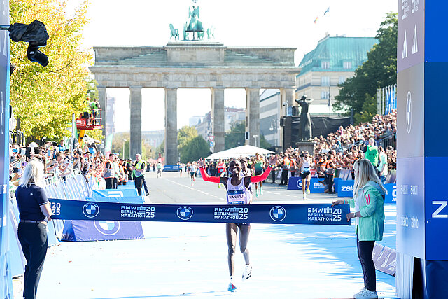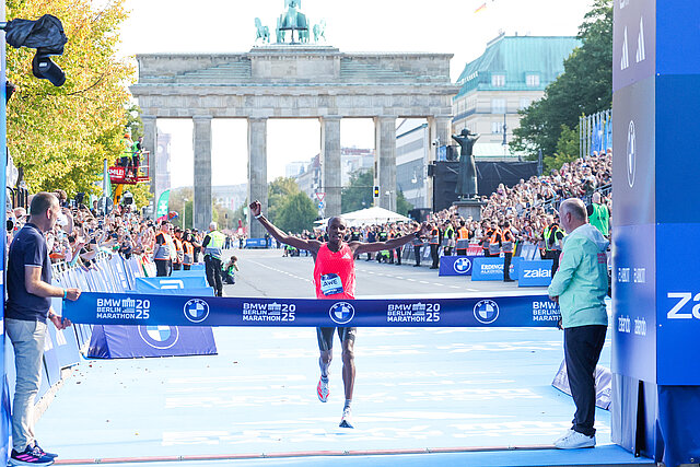 Sabastian Sawe wollte in Berlin herausfinden, wie schnell er rennen kann. Der 30-Jährige lief in der ersten Hälfte des Rennens ein atemberaubendes Tempo. Geführt von Tempomachern passierte der Kenianer die 10-km-Marke nach 28:26 Minuten - dies deutete auf eine Zielzeit von knapp unter zwei Stunden hin. An der Halbmarathon-Marke lag Sabastian Sawe mit 60:16 Minuten genau auf Kurs für den Weltrekord von 2:00:35. Während der Titelverteidiger Milkesa Mengesha (Äthiopien) hier nicht mehr mithalten konnte und das Rennen später vorzeitig beendete, waren nach nur 23 km auch die Pacemaker am Ende ihrer Kräfte. In der Wärme musste Sabastian Sawe nun alleine an der Spitze laufen und konnte das Tempo nicht ganz halten. Bei Kilometer 30 lag er mit einer Zwischenzeit von 1:26:06 Stunden noch auf Kurs für den Streckenrekord, den Eliud Kipchoge (Kenia) 2022 mit 2:01:09 aufgestellt hatte. Am Ende reichte es aber nicht für Rekorde. „Ich habe mein Bestes gegeben und freue mich sehr, dass ich das Rennen gewonnen habe. Es war hart in der Wärme“, sagte Sabastian Sawe, der nun nach Valencia und London auch seinen dritten Marathon gewonnen hat. „Das war eine unglaubliche Leistung von Sabastian bei diesen Bedingungen - ich kann ihm nur gratulieren“, sagte Race-Direktor Mark Milde.