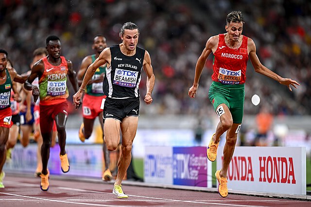 Geordie Beamish war in seinem Vorlauf gestürzt, stand dann aber blitzschnell wieder auf den Beinen und lief sogar noch auf Rang zwei nach vorne. Im Finale überraschte er auf der Zielgeraden mit einem starken Spurt Soufiane El Bakkali. Der Marokkaner hatte am letzten Wassergraben die Führung übernommen und sah nach dem letzten Hindernis schon wie der sichere Sieger aus. Doch El Bakkali fühlte sich zu sicher, zog seinen Sprint nicht durch und wurde dann noch von Beamish überholt. Vor zwei Jahren war der Neuseeländer bei der WM Fünfter über die Hindernisse. Mit seiner Bestzeit von 8:09,64 zählte er nicht zu den Topfavoriten, allerdings hat er ein sehr starkes Sprintvermögen. 2024 war der 28-Jährige Hallen-Weltmeister über 1.500 m.
